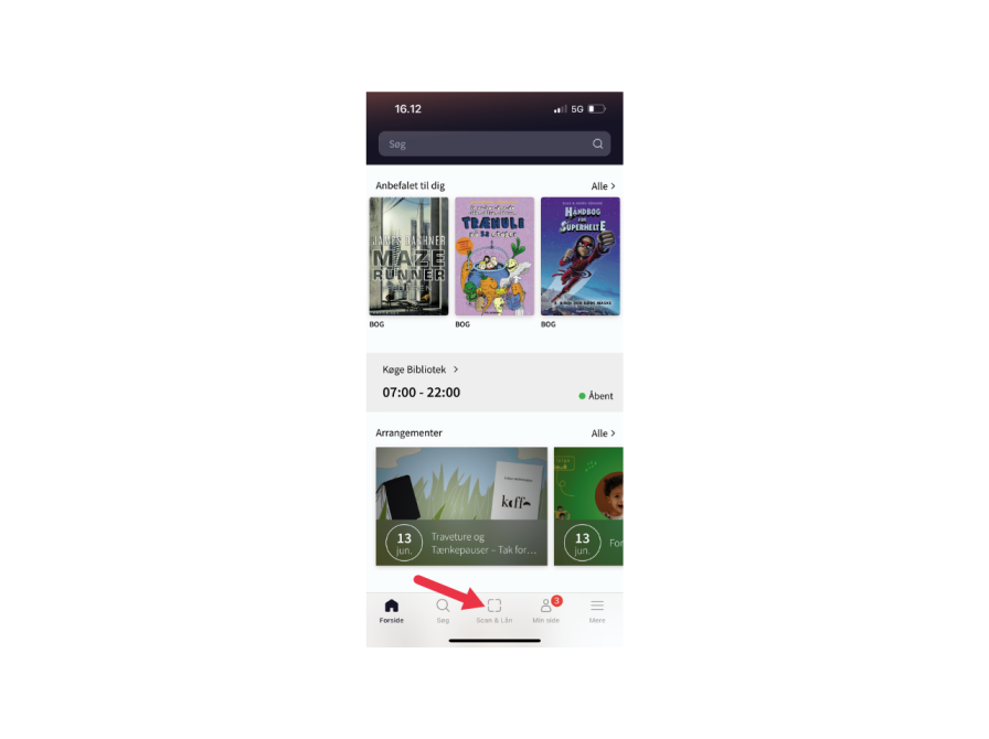 1. Tryk på 'Scan og lån'-funktionen, der ligger i midten af appens bundmenu