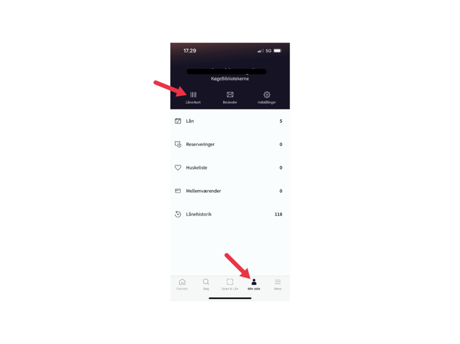 Du finder lånerkort funktionen under 'Min side' og ved at klikke på knappen 'Lånerkort':