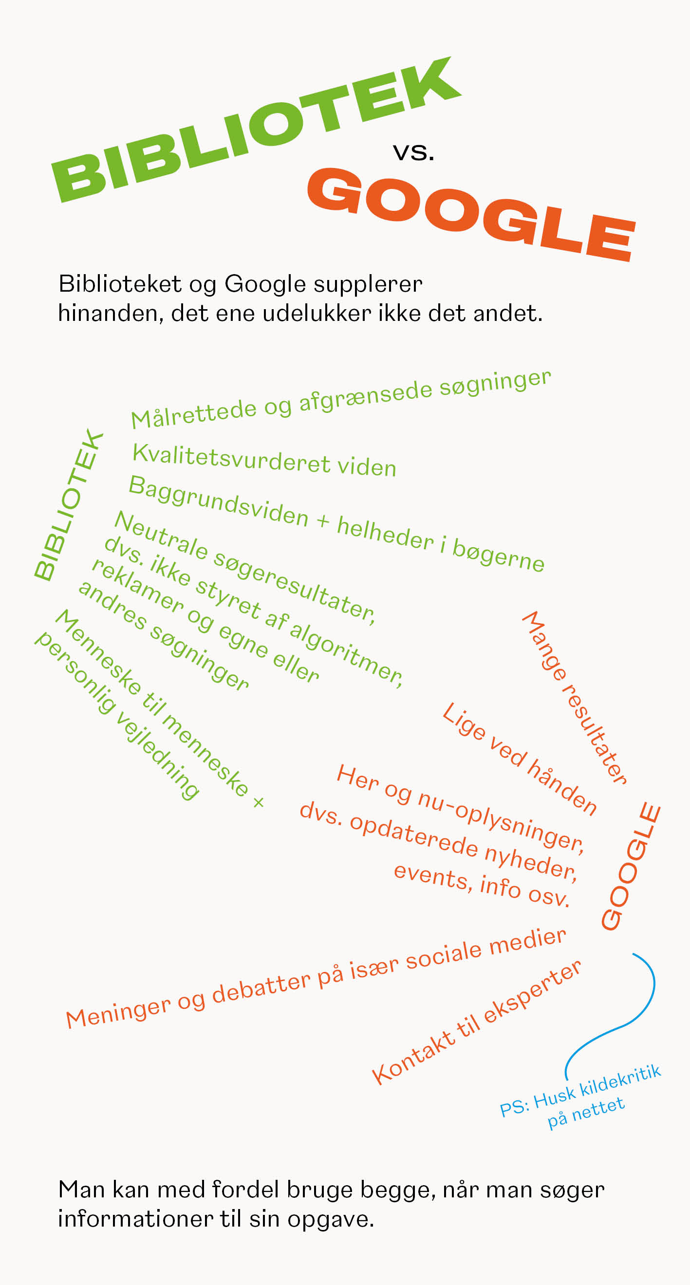 Biblioteket og Google supplerer hinanden, og du kan med fordel bruge begge dele til at finde information til din opgave.