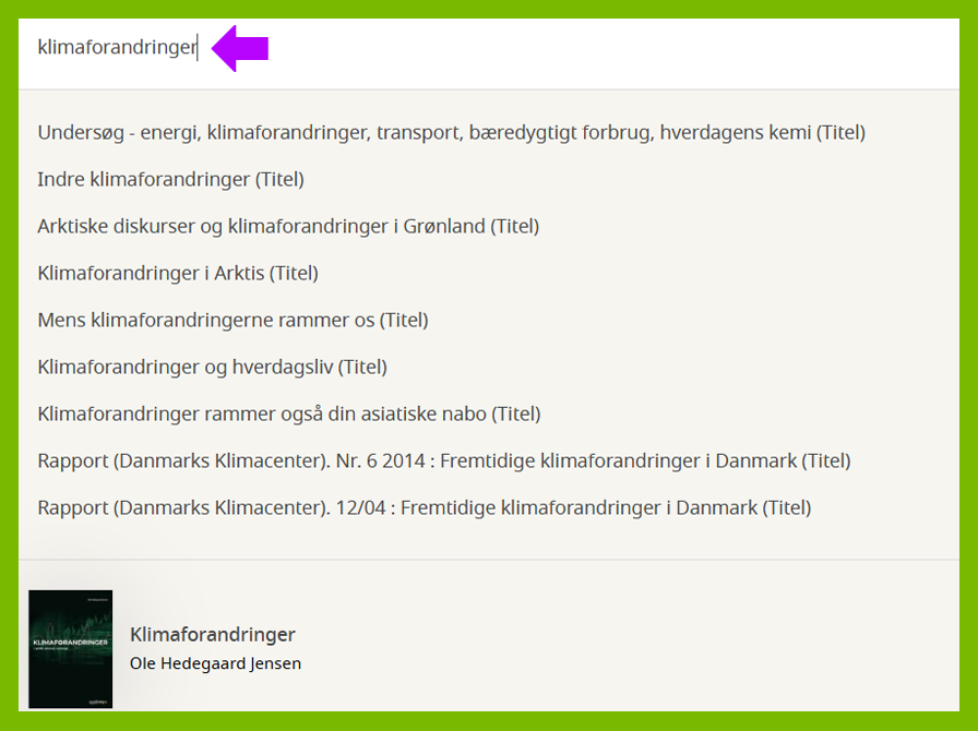 Når du vil søge, skriver du dit søgeord i søgefeltet - f.eks. ’klimaforandringer’.