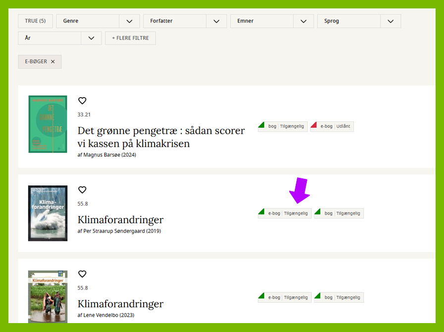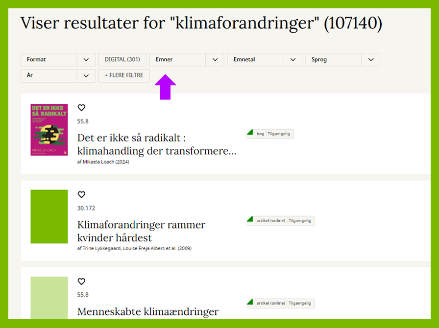Det gør man i de små felter lige under overskriften - f.eks. "Format", "Emner", "Sprog" og "År". Se billedet herunder.