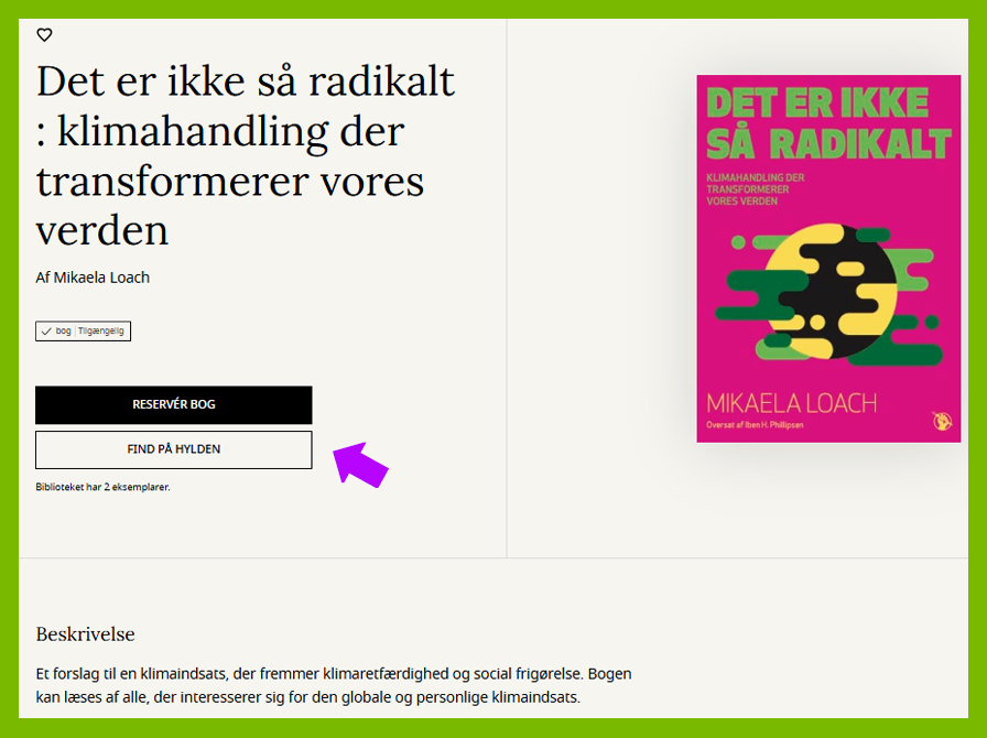 Hvis du klikker på "Find på hylden", kan du se om bogen er hjemme på et af vores biblioteker og hvor.