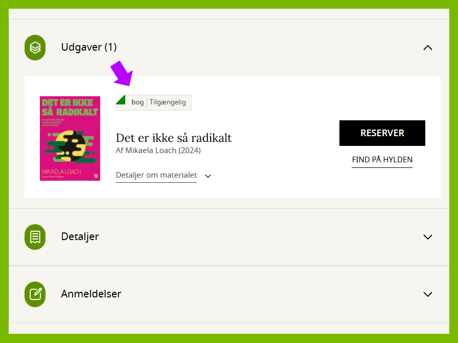 Se den lille etiket med "folden". Hvis folden er rød, er bogen udlånt. Hvis den er grøn, er bogen tilgængelig.